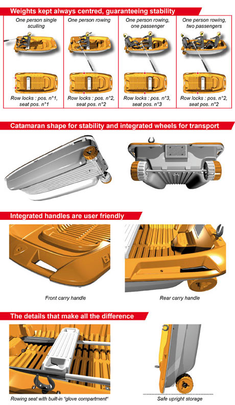 Το κάθισμα κωπηλασίας έχει δύο μικρές θήκες για μικρά αντικείμενα . Το σκάφος είναι εύκολο να αποθηκευτεί ακόμη και όρθιο για να καταλαμβάνει λιγότερο χώρο.